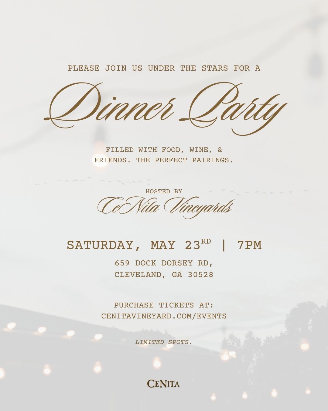 Join CeNita Vineyards for an exclusive four-course dining experience under the stars on Friday, May 23, 2026, at 7:00 PM.