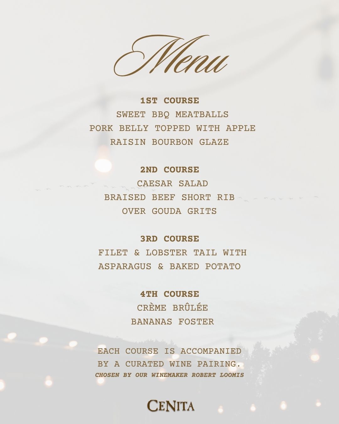 Limited to 26 guests, this intimate evening features a gourmet meal prepared by Cowboys and Angels, with each course expertly paired with CeNita estate wines hand-selected by our Head Winemaker, Robert Loomis.